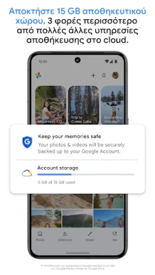 Κάθε ανάμνηση είναι ένα πολύτιμο κομμάτι της ιστορίας σας. Με τις Φωτογραφίες Google, μπορείτε να διασφαλίσετε ότι καμία από αυτές δεν θα χαθεί ποτέ. Απολαύστε την απεριόριστη σιγουριά που προσφέρει η Google με 15 GB δωρεάν αποθηκευτικού χώρου στο cloud, ένας χώρος τρεις φορές μεγαλύτερος από πολλές άλλες πλατφόρμες, διαθέσιμος σε κάθε λογαριασμό Google. Αυτός ο γενναιόδωρος χώρος, που μοιράζεται αρμονικά με το Gmail και το Google Drive, σας επιτρέπει να δημιουργείτε αυτόματα αντίγραφα ασφαλείας για κάθε φωτογραφία και βίντεο, προστατεύοντας τις αγαπημένες σας στιγμές σε όλες σας τις συσκευές. Πείτε αντίο στο άγχος του γεμάτου τηλεφώνου και απολαύστε την ηρεμία ότι οι αναμνήσεις σας είναι πάντα ασφαλείς, προστατευμένες από την προηγμένη υποδομή ασφαλείας της Google.